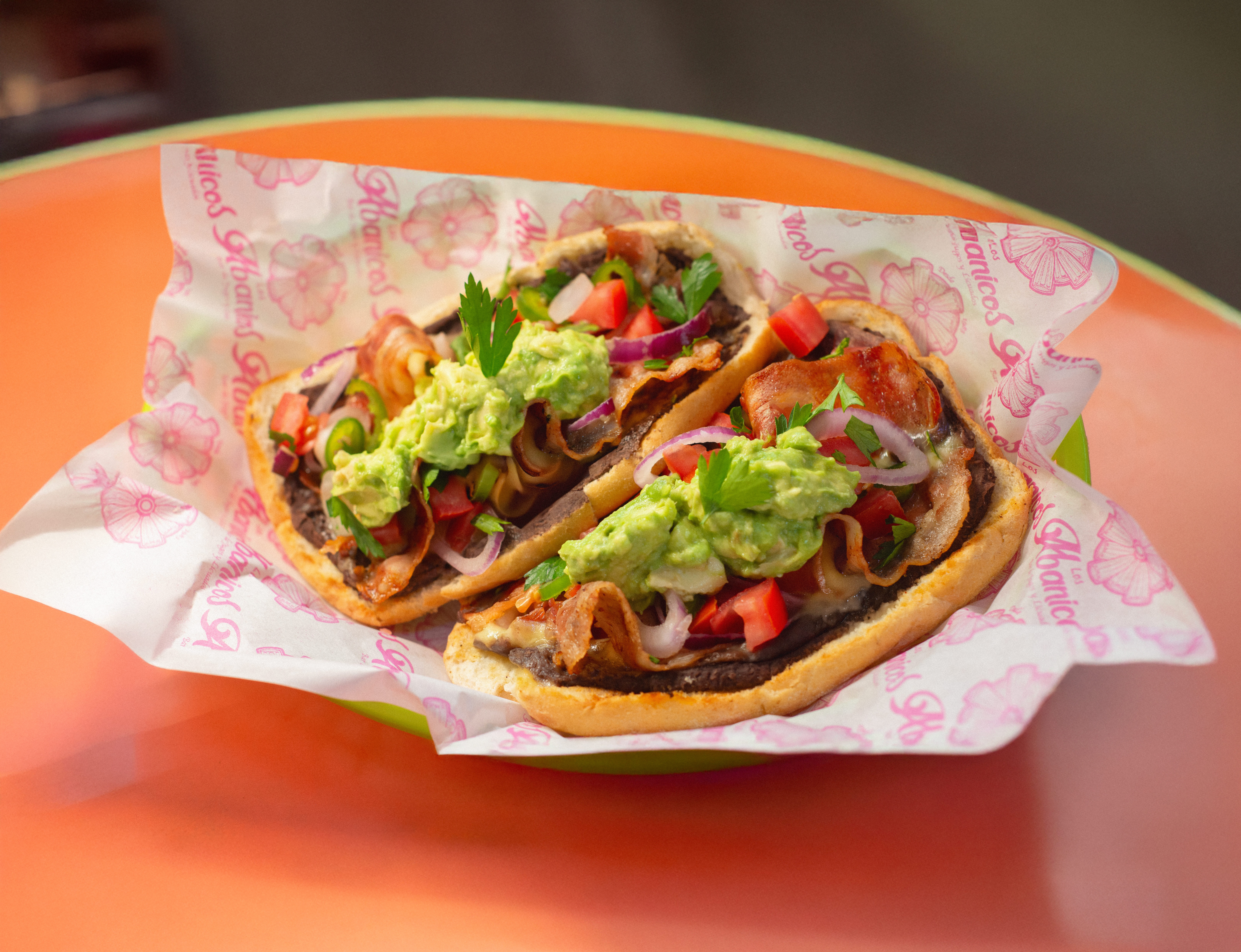 Pan calientito con frijoles, queso gratinado, guacamole y tocino dorado. Acompañados de pico de gallo.