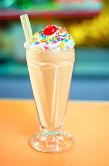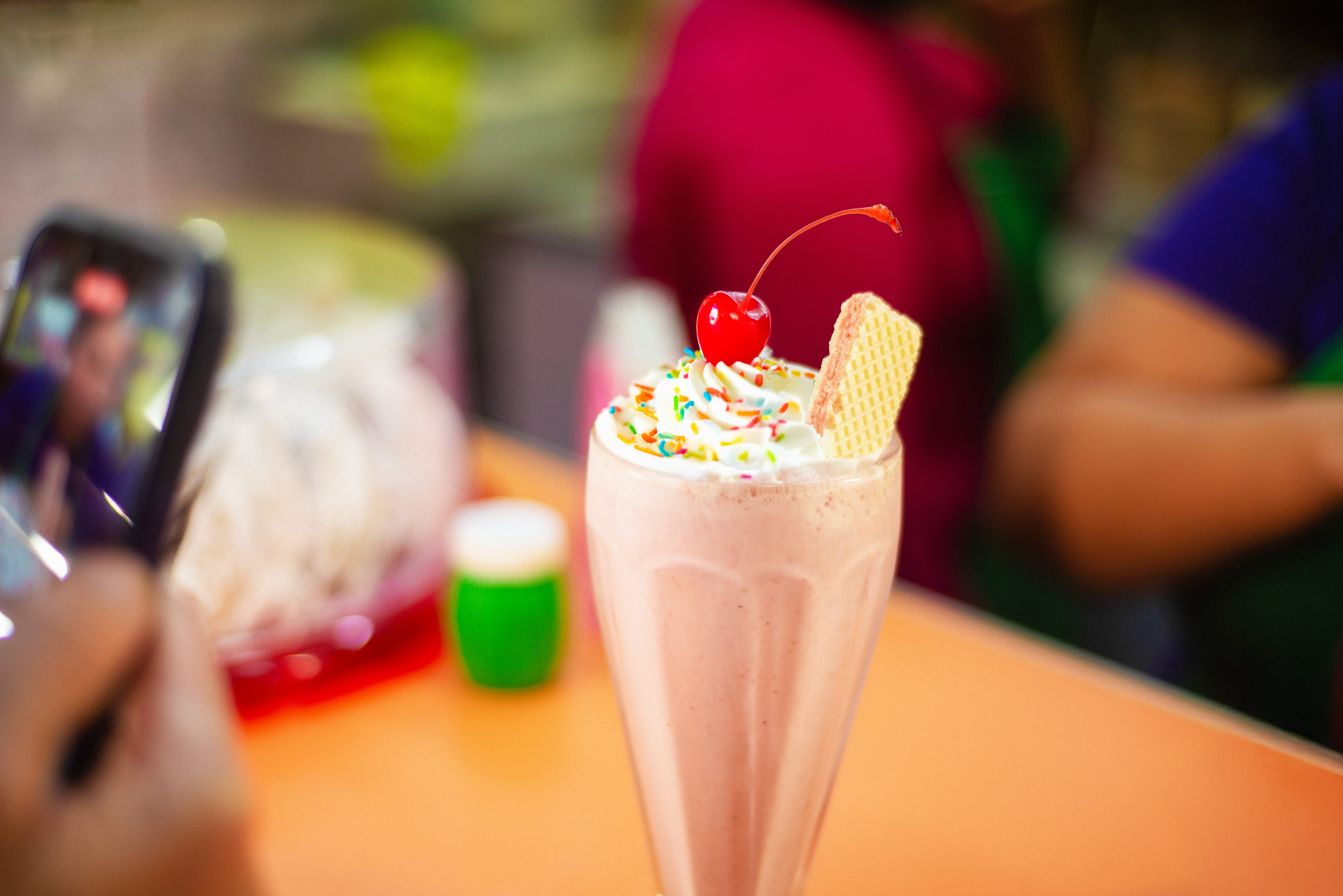 Suave y cremosa, receta especial con hecha con helado de vainilla, arriba crema batida, chispas y cereza.