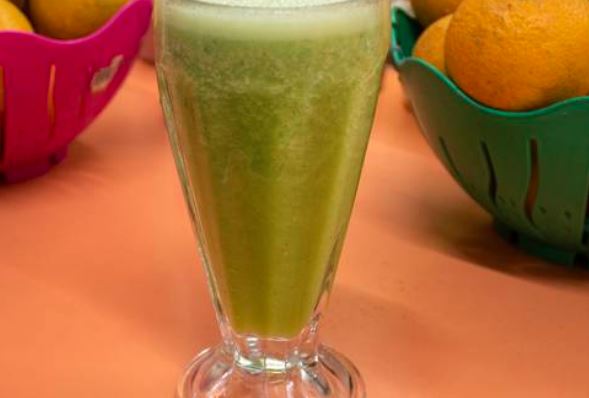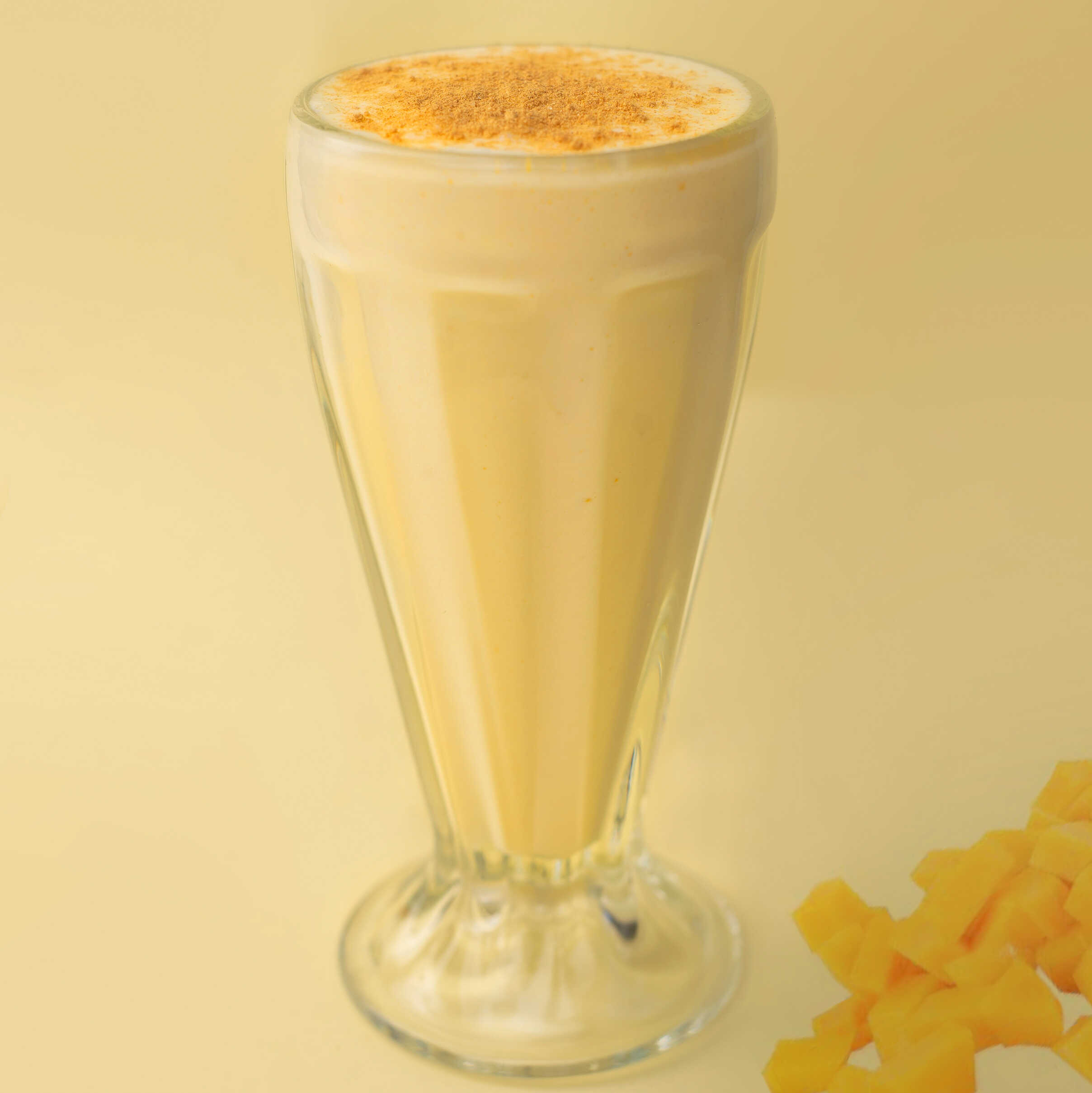 Delicioso licuado de mango, yogurt, naranja y plátano.