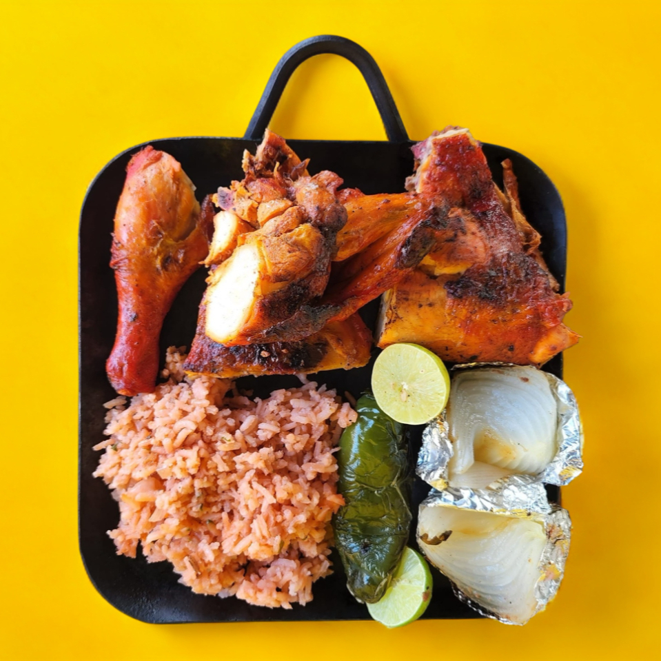 Pollo a las brasas acompañado de tortillas, tostadas, chile toreado, salsas y arroz.