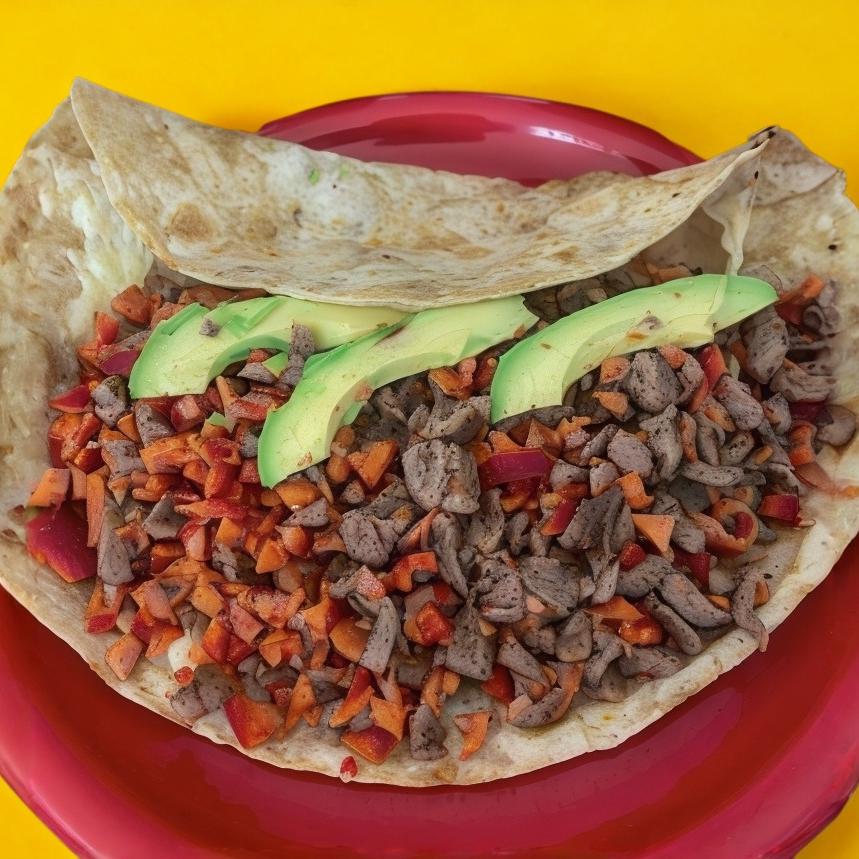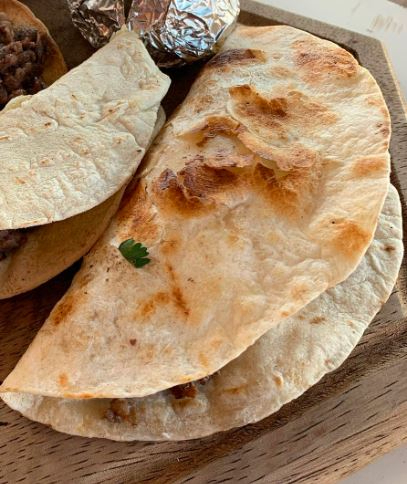 Tortilla de harina 15cm, elaborada con queso,carne y aguacate. Acompañado con cebolla, cilantro, limón y salsa. La Gringa solo viene con la carne, los complementos van por separado.