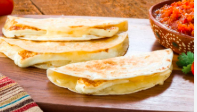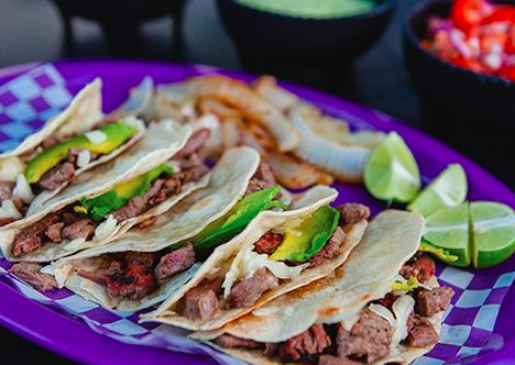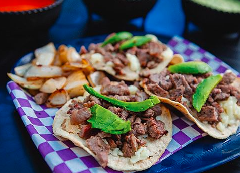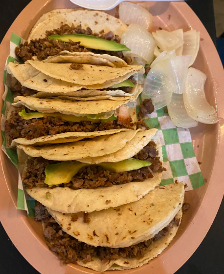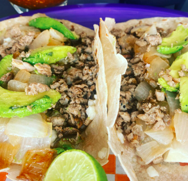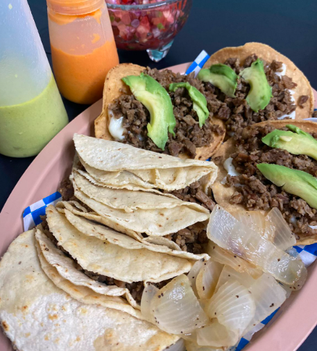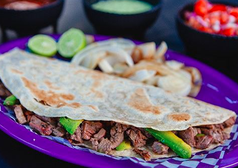 Tortilla de harina con cebolla, cilantro y salsa verde aparte.