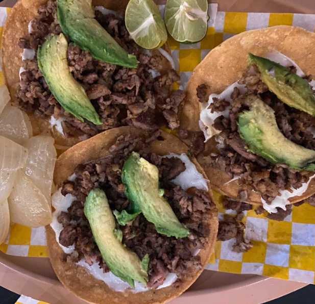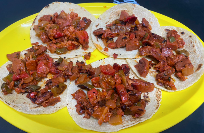 Tortilla de maíz con cebolla, cilantro y salsa verde aparte.