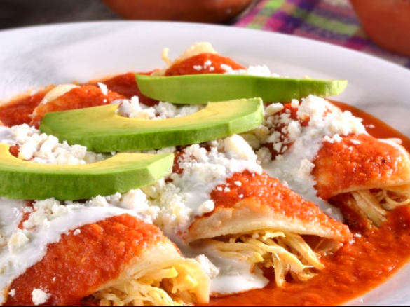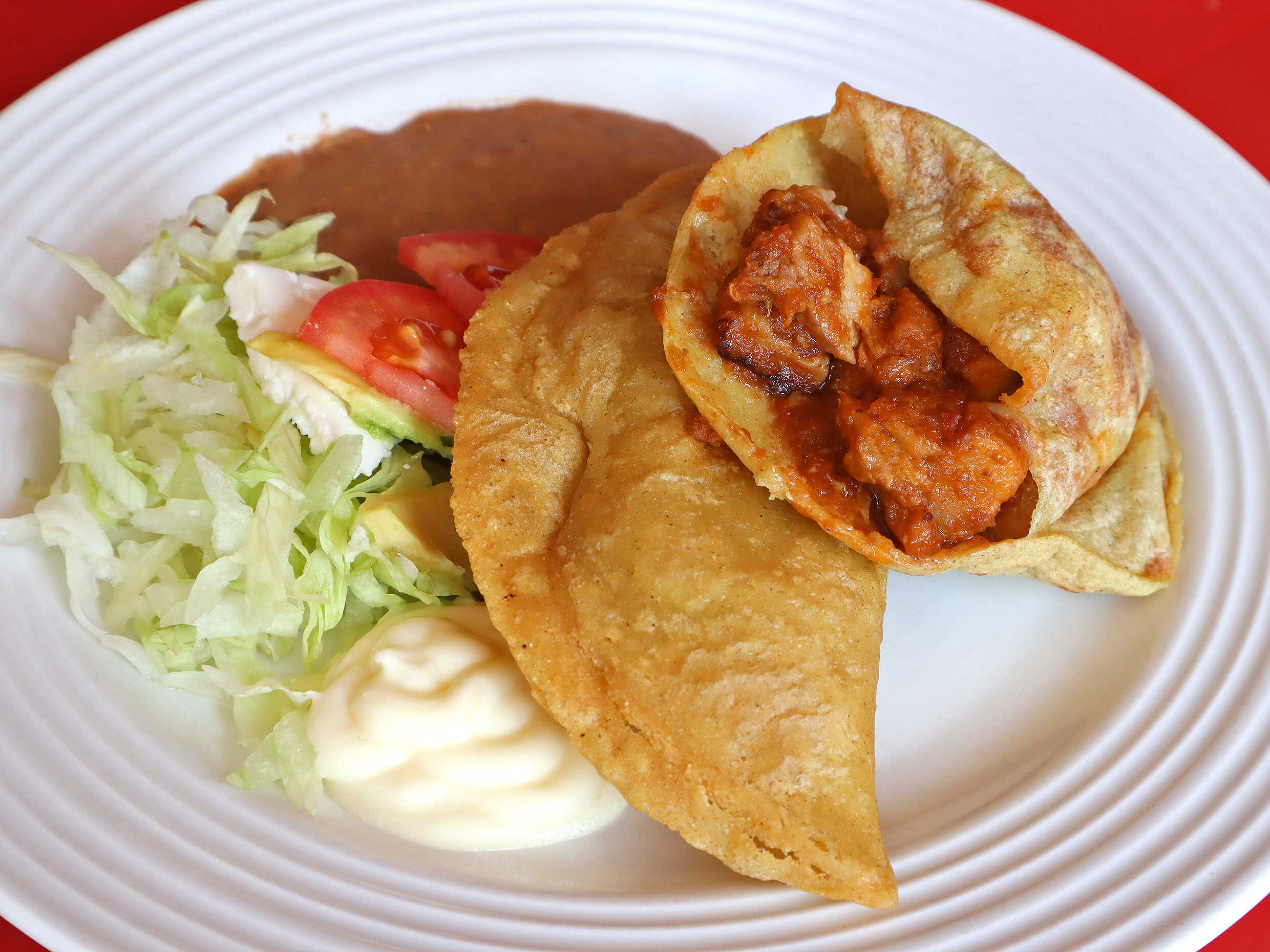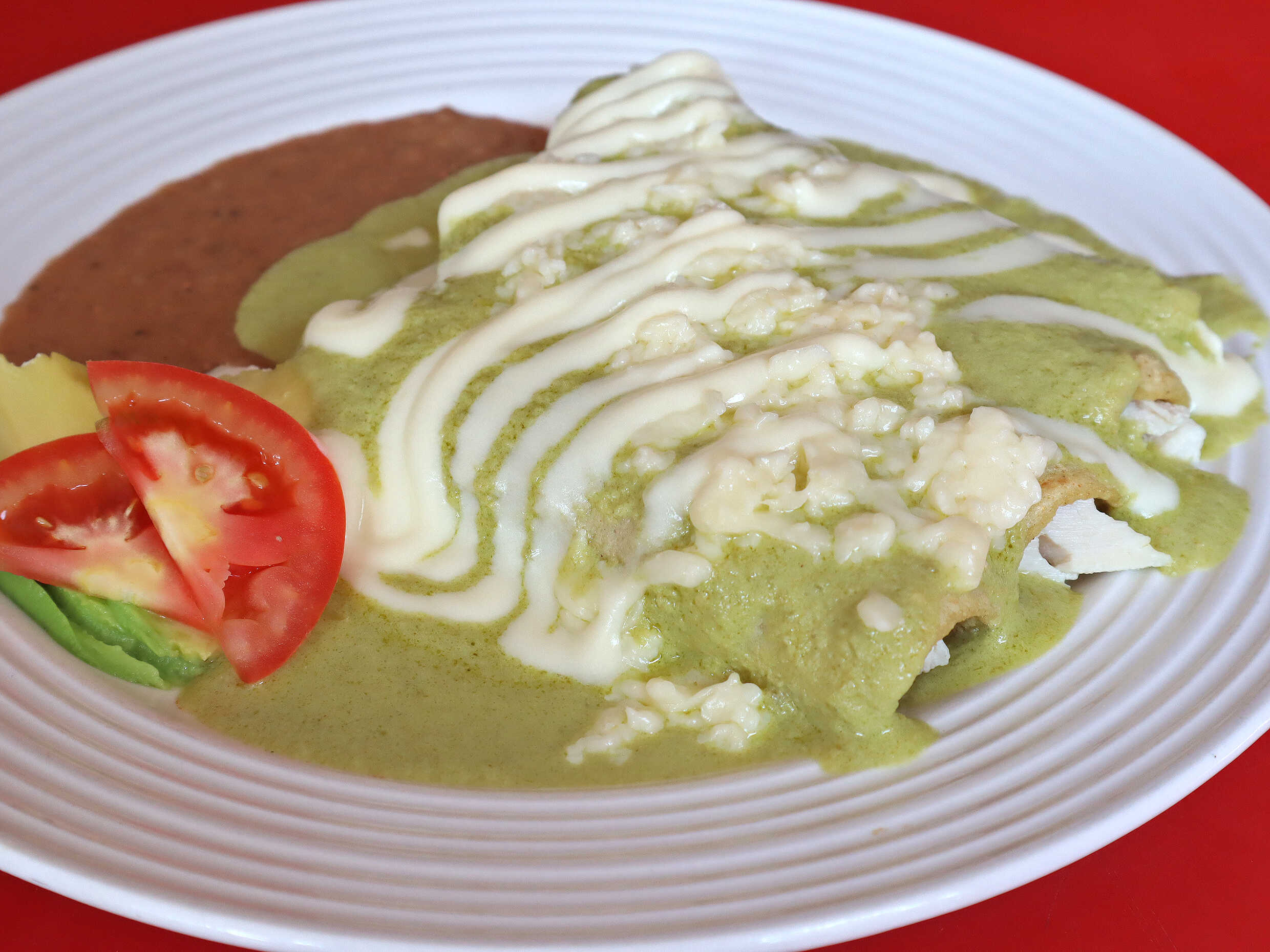Acompañadas de frijoles refritos, salsa y tortillas.
