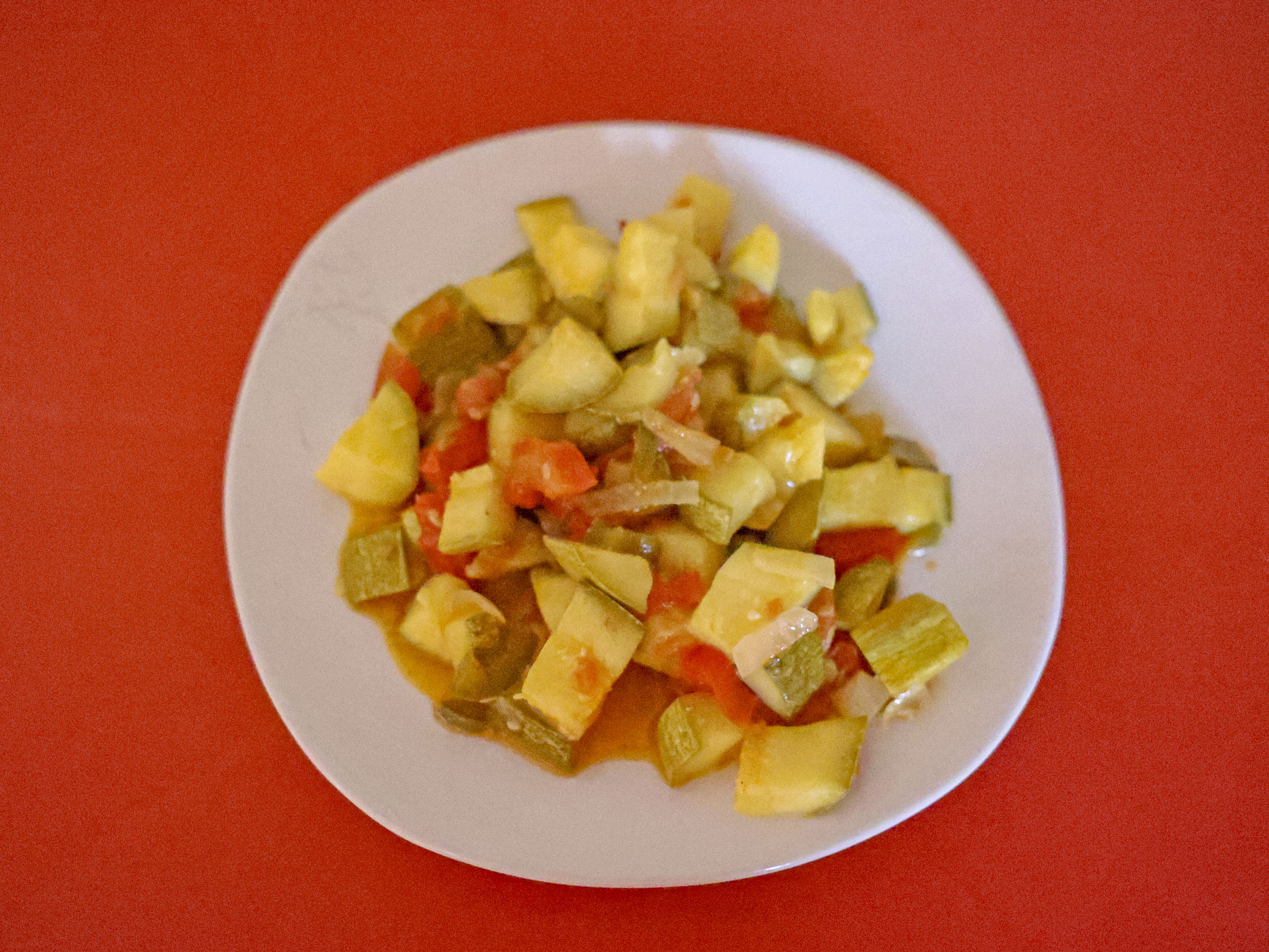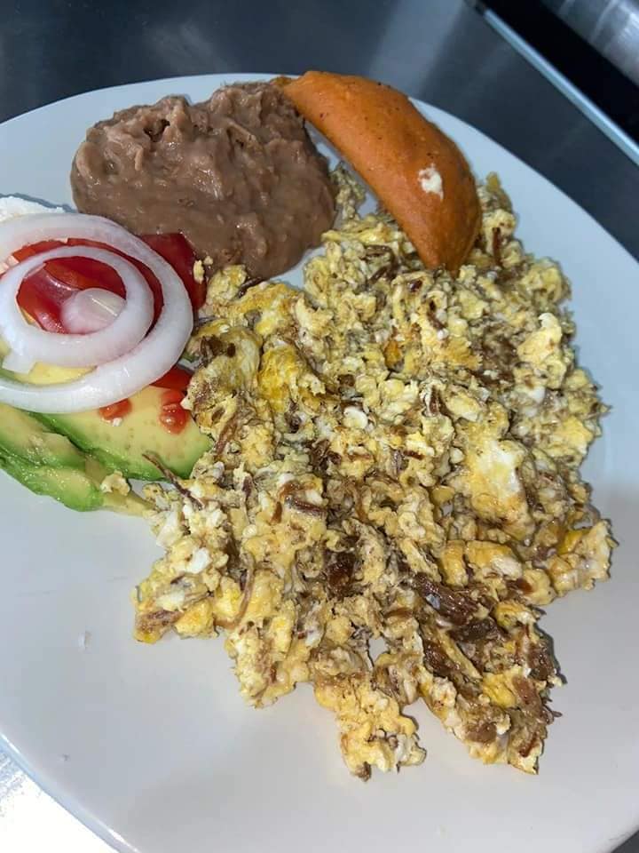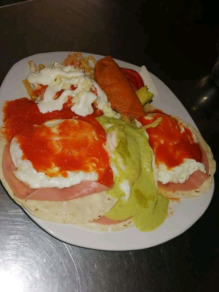 Huevos estrellados bañados con salsa de chile, tomate, cebolla.