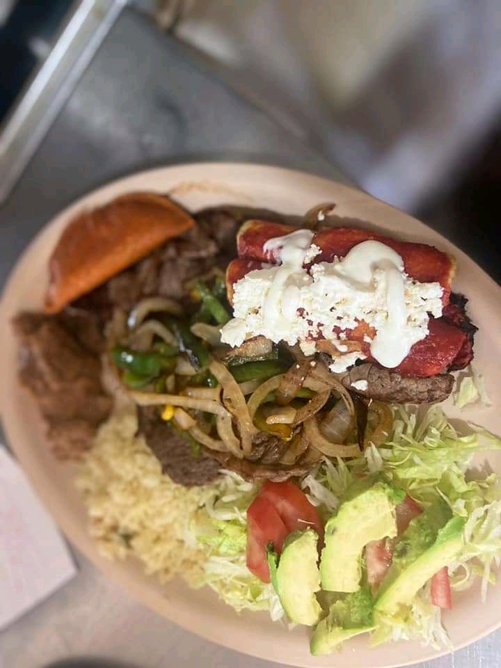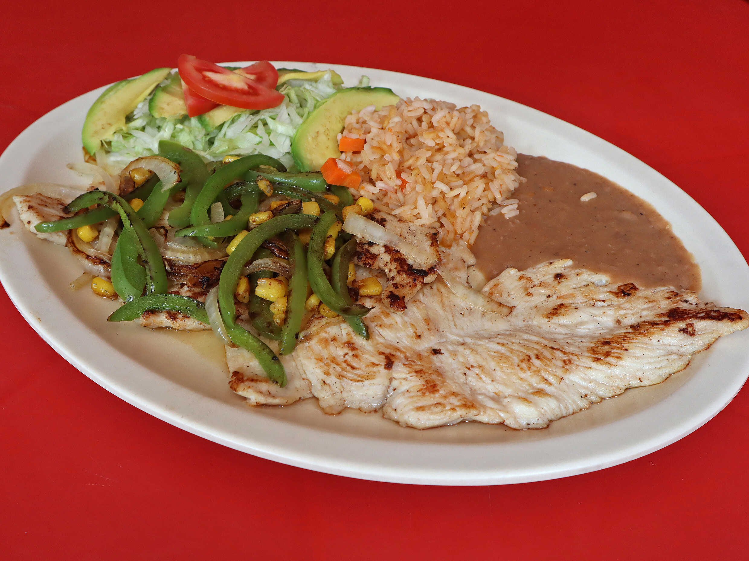 Arrachera, arroz, frijol, 2 enchiladas y verdura