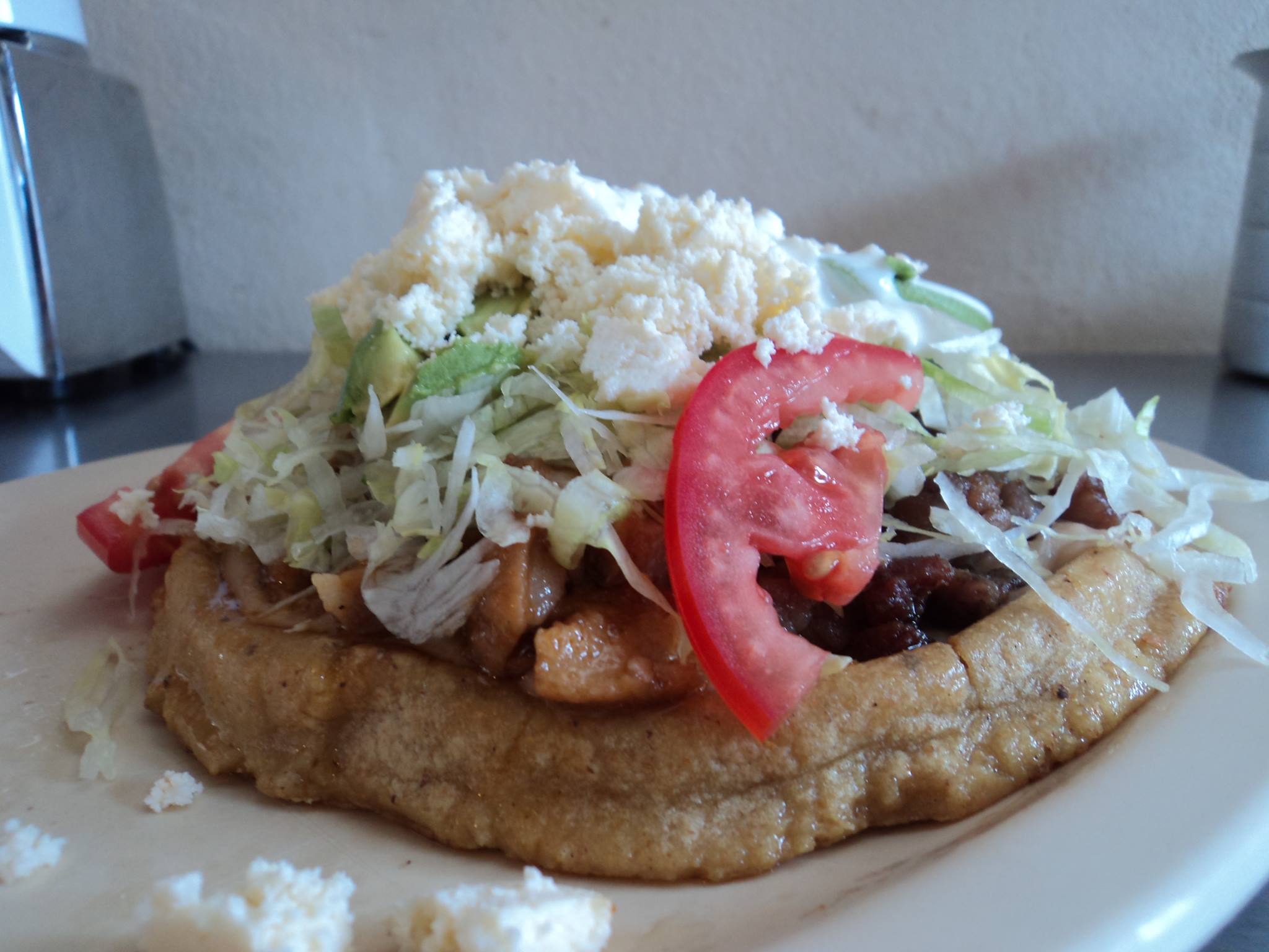 1 porcion individual de 10 cm contiene base de masa que lleva frijoles un guiso lechuga jitomate aguacate queso crema