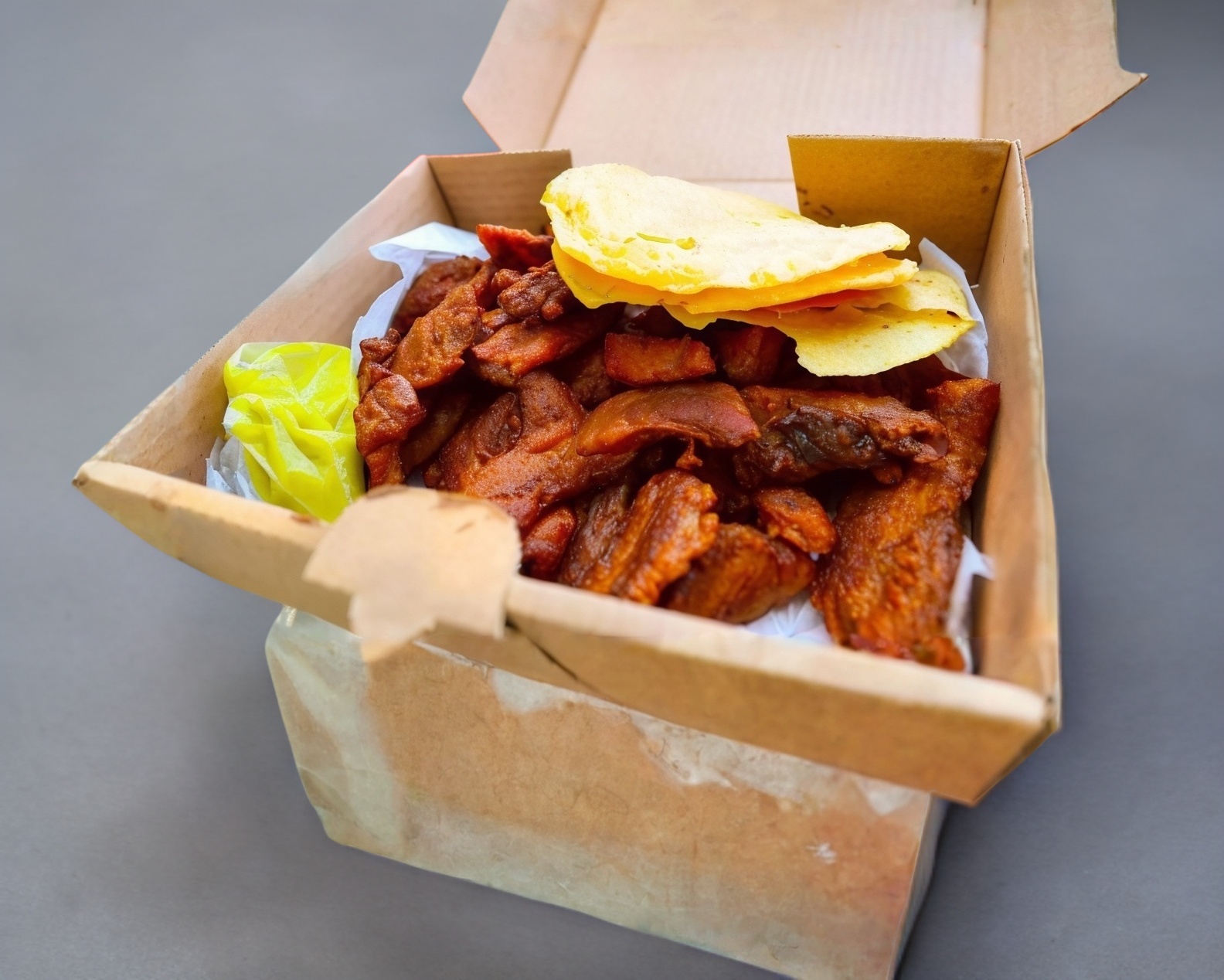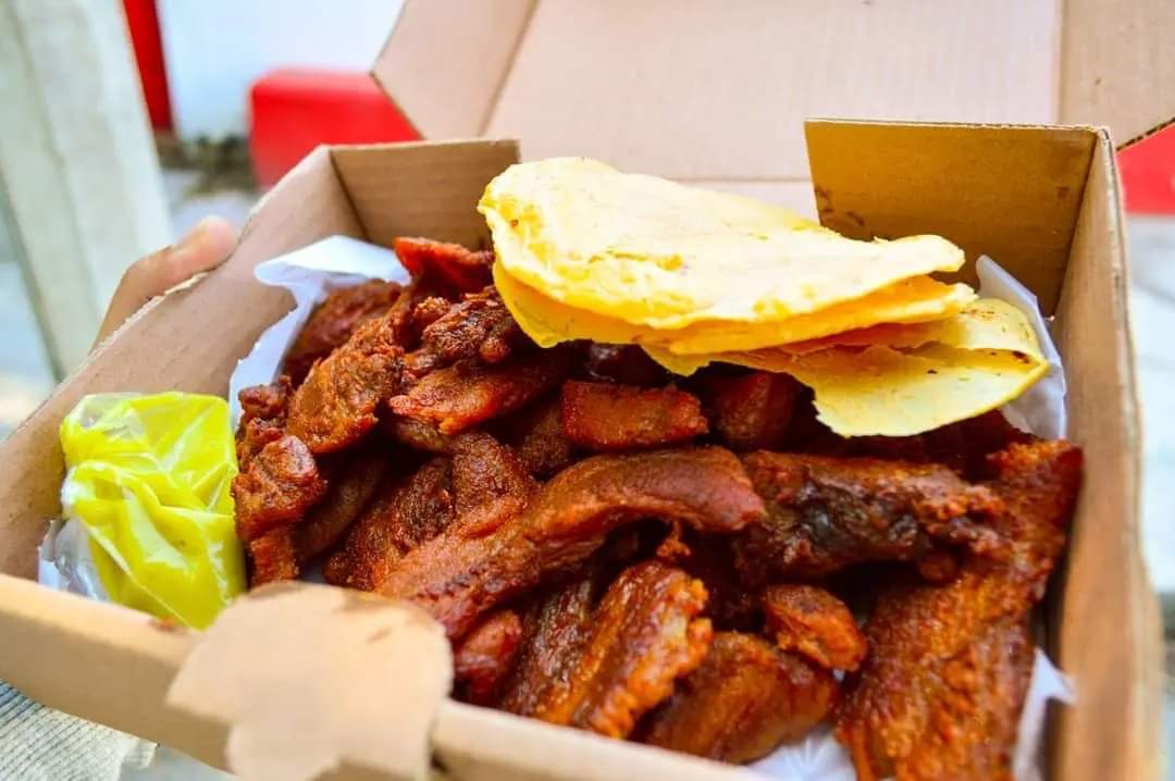 200gm de Chicharron, 1 bebida, tostadas o 1/2 de tortillas y salsa.