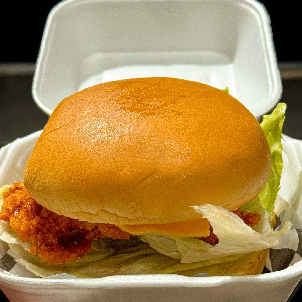 pan brioche, 2 tiras de pollo, lechuga, queso amarillo americano, aro de cebolla empanizado acompañado de papas francesas