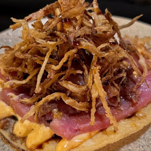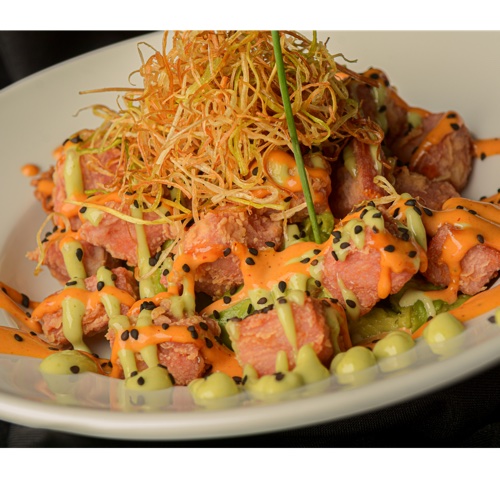 Chicharron de atun crujiente con aguacate, aderezo de chipotle, aderezo de cilantro, ajonjolí negro y poro frito.