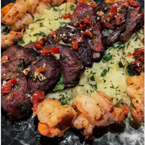 Picaña con camarones, acompañado de puré y salsa de carne.