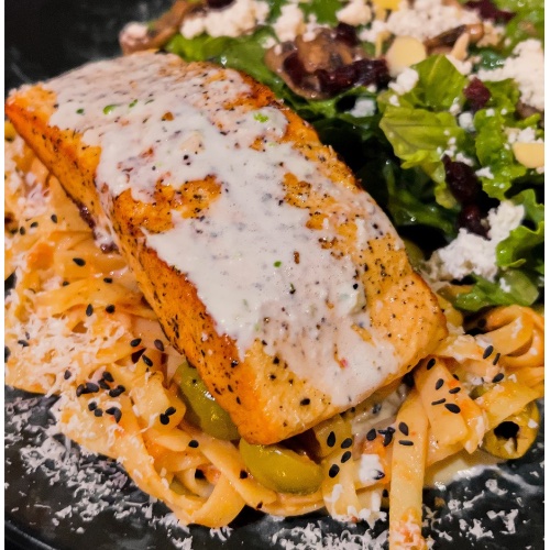 Salmón marinado al piquín con pasta fetuccini a la puttanesca, acompañado de una guarnición de ensalada de cremini.