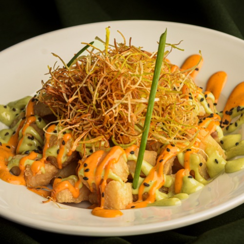 Chicharron de pescado crujiente con aguacate, aderezo de chipotle, aderezo de cilantro, ajonjolí negro y poro frito.