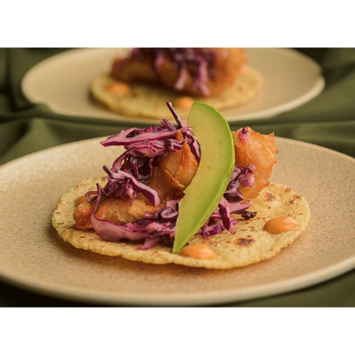 Ricos camarones en tempura al estilo Ensenada acompañados con col morada en aliño de vinagreta de lima y aguacate.