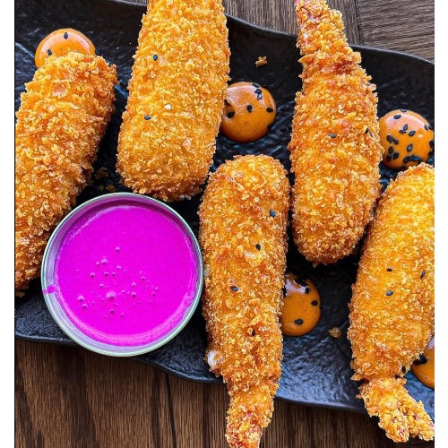 Empanizados en panko y envueltos en queso crema, acompañados de aderezo de chipotle y salsa de betabel al piquín.