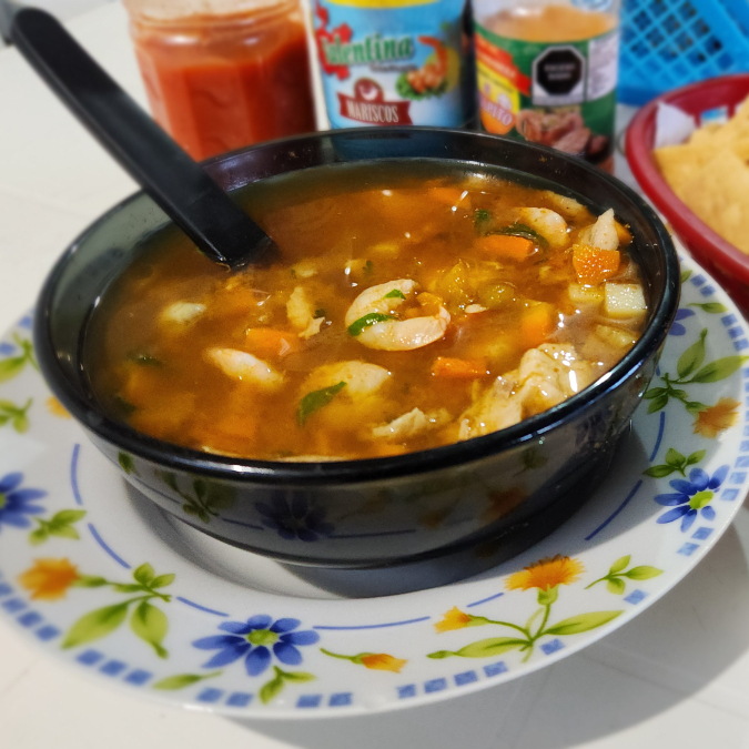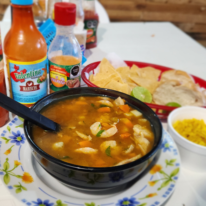 Medio litro de sopa de mariscos, incluye porcion de arroz, salsa, totopos, bolillo, limon.