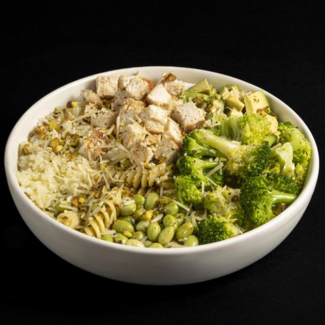 FUSILLI AL PESTO, EDAMAMES, AGUACATE, BROCOLI, ARROZ DE COLIFLOR, PECHUGA DE POLLO AL GRILL, PISTACHE Y PARMESANO