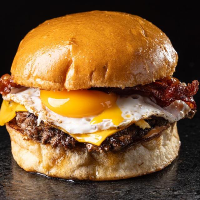 PAN BRIOCHE, DOBLE PATTY DE 80G PRIME MEAT SMASH, DOBLE QUESO AMERICANO, ADEREZO DE LA CASA, HUEVITO ESTRELLADO, TOCINO AHUMADO Y MIEL DE MAPPLE