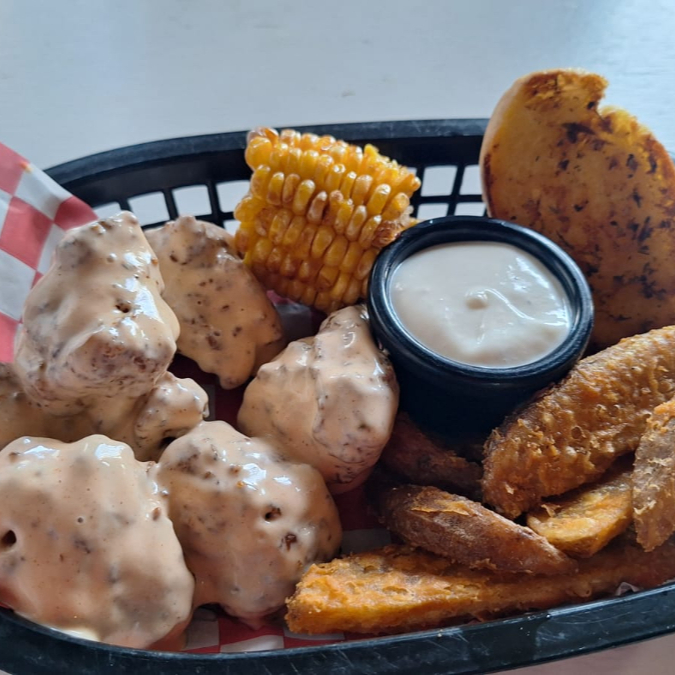 6 Boneless, pan, porción de papas gajo, elote amarillo y té de 1/2 L.