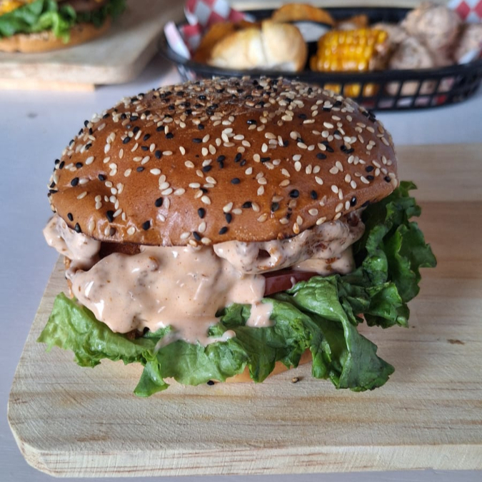 La tradicional de la casa: carne 100% res, queso derretido y vegetales simple, jugosa y sin fallas.
