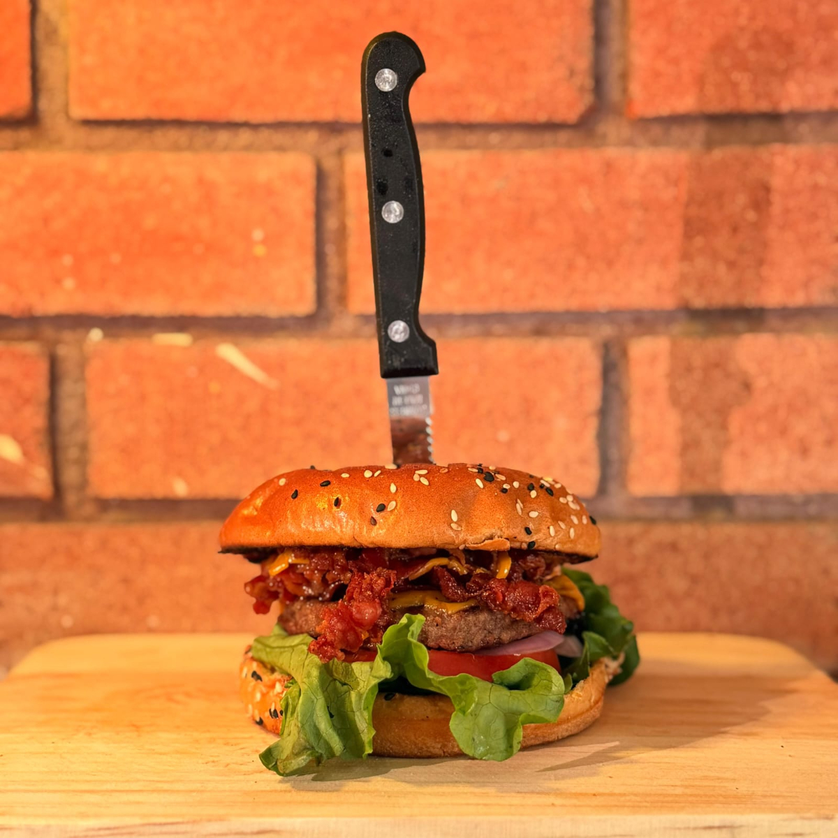 Con tocino, tocino ahumado, doble queso y carne jugosa.