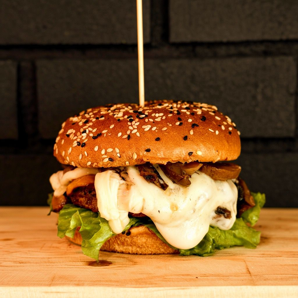 Champiñones salteados, queso derretido y carne al grill.