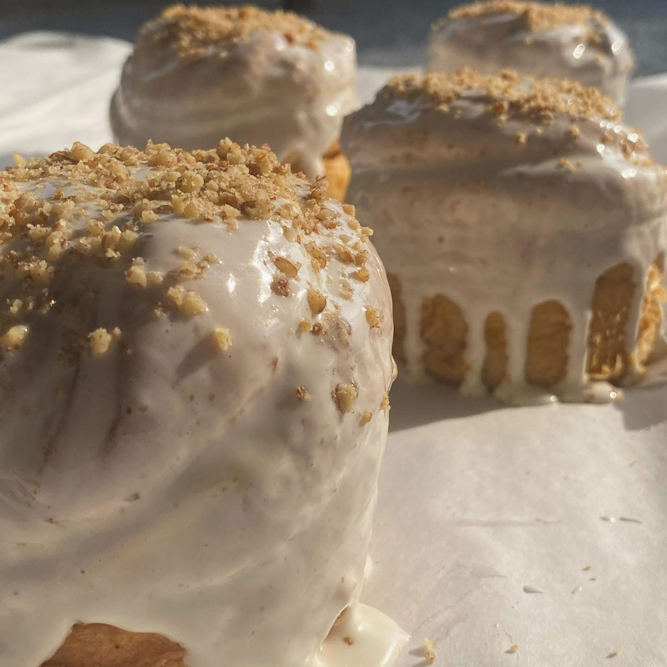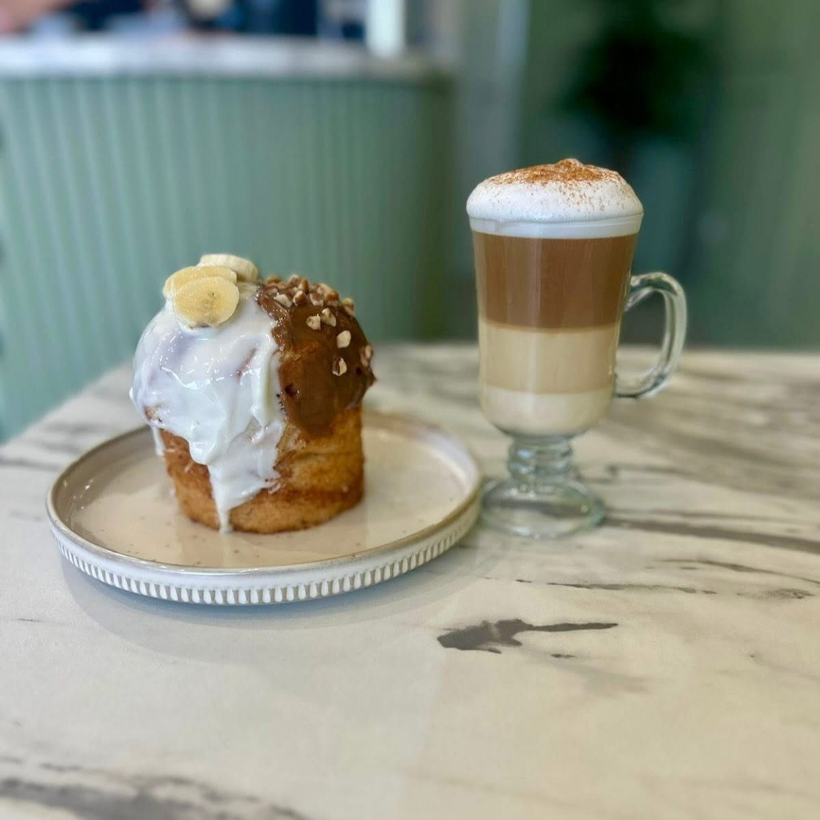 Roll de canela horneado con cubierta de leche y plátano.