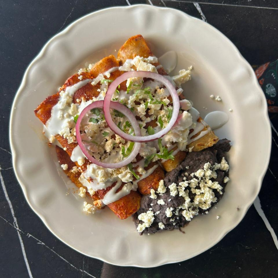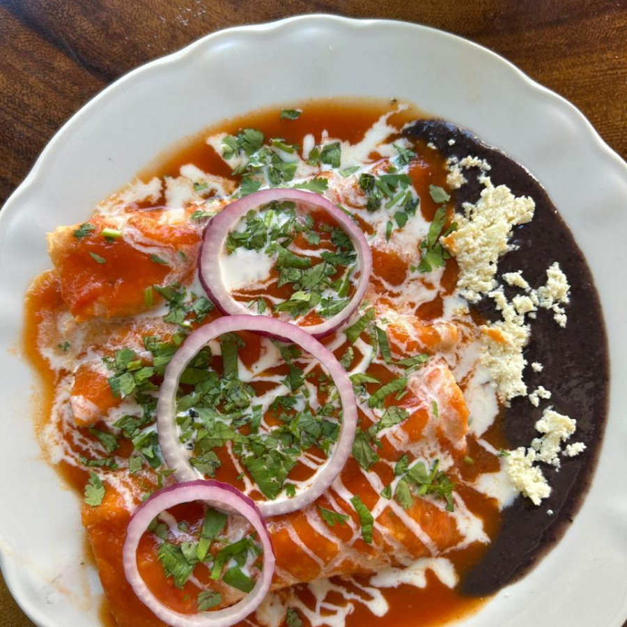 Tortillas de maíz rellenas de queso y cebolla blanca, bañados en salsa roja.