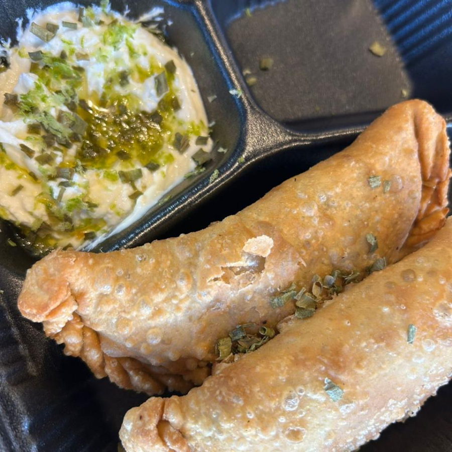 Rellenas de carne molida guisada con almendras, cebolla y especias mediterráneas. Se sirve con dip de jocoque con za'atar y aceite de oliva.