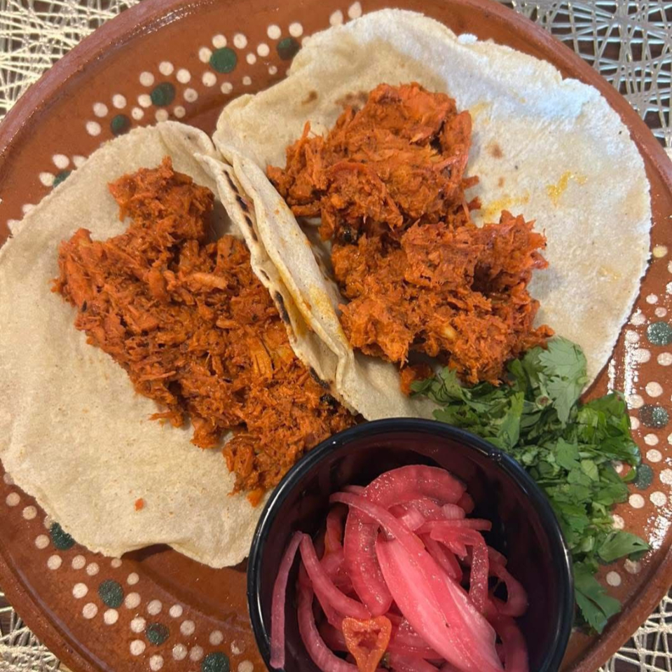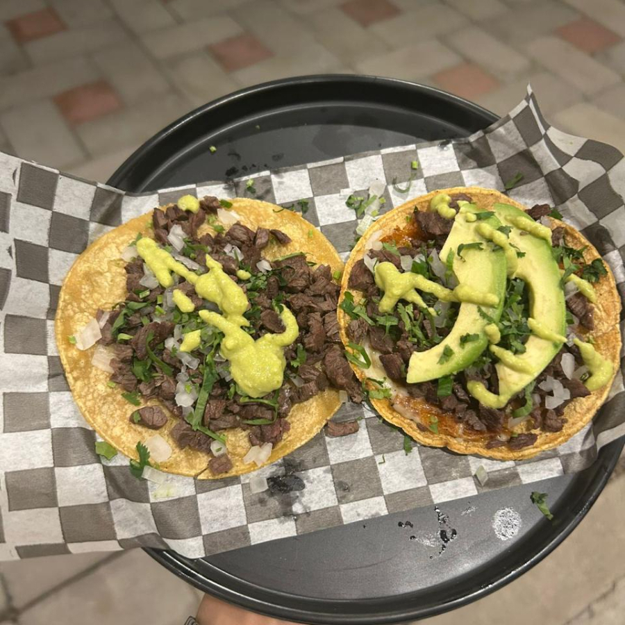 Tortilla de maíz amarilla, carne arrachera prime, cebolla y cilantro.