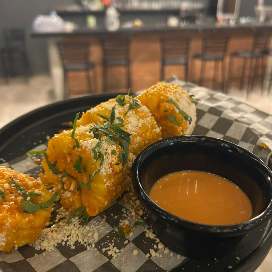 Elotito amarillo dulce bañado en salsa búfalo espolvoreados de queso parmesano.