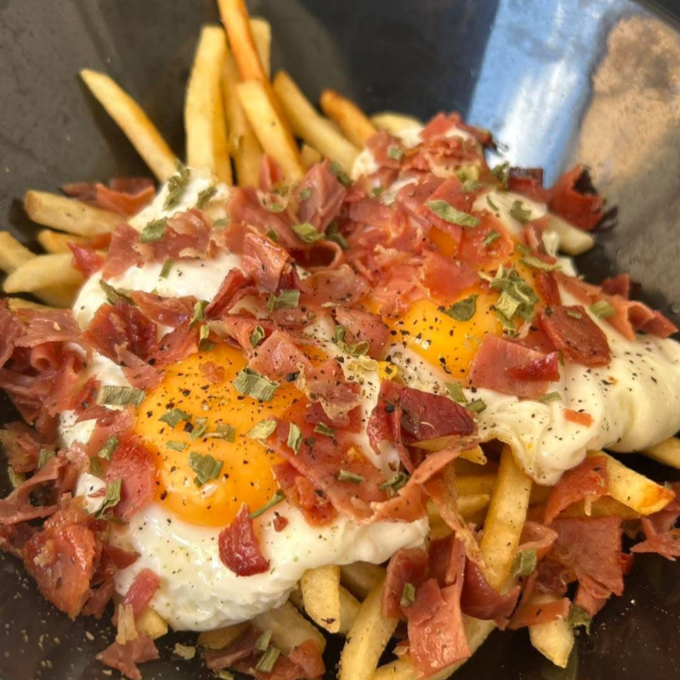 Papas fritas de corte delgado, aceite de trufa y queso parmesano. Salsa cátsup y dip de hamburguesa.