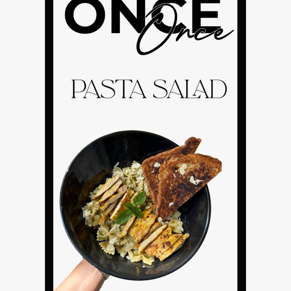 Pasta farfalle, tomate deshidratado, espinaca baby, albahaca fresca, pesto y parmesano rallado. Se acompaña con una rebanada de pan con ajo.