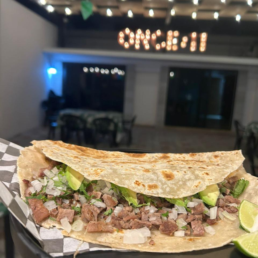 Tortilla de harina grande con queso gratinado, carne arrachera prime, aguacate cebolla y cilantro.