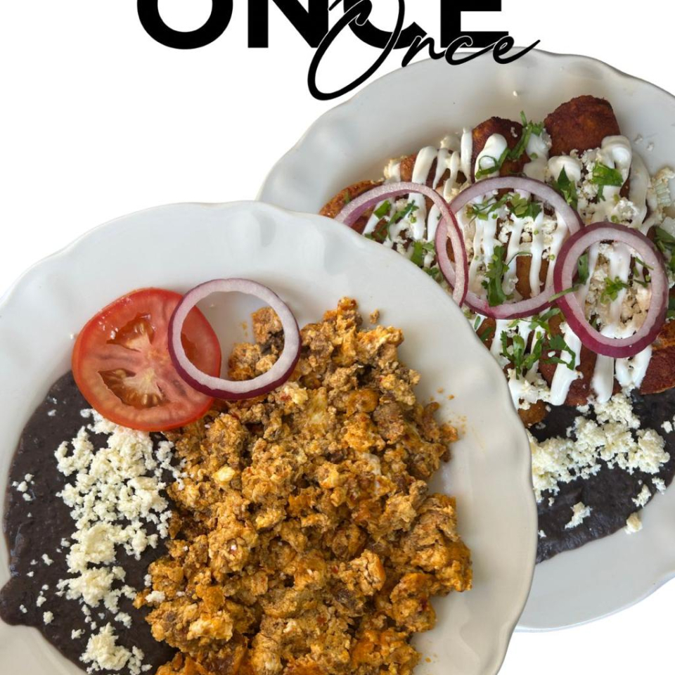Totopos de maíz, con salsa de tu elección, frijoles de la casa, queso rallado, crema y cebolla cruda. Agrega proteína favorita con costo extra.