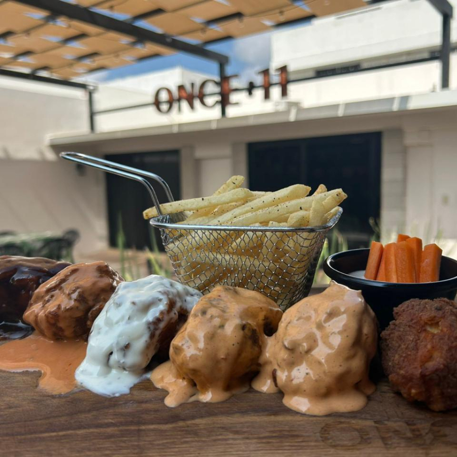 Ocho alitas bañadas en salsa de tu elección, acompañado de papas fritas.