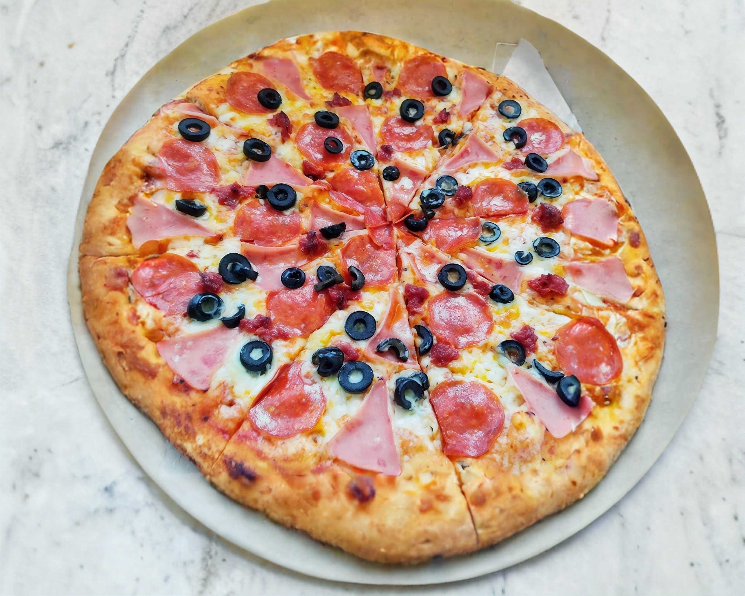 Pizza grande 3 carnes (pepperoni, jamón y salchicha de pavo)