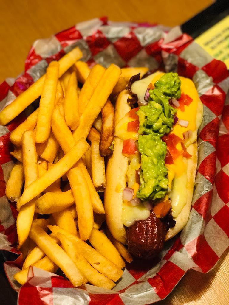 Salchicha envuelta en tocino, bañada en queso amarillo, queso fundido, aderezo chipotle, vegetales y guacamole. Incluye papas a la francesa.