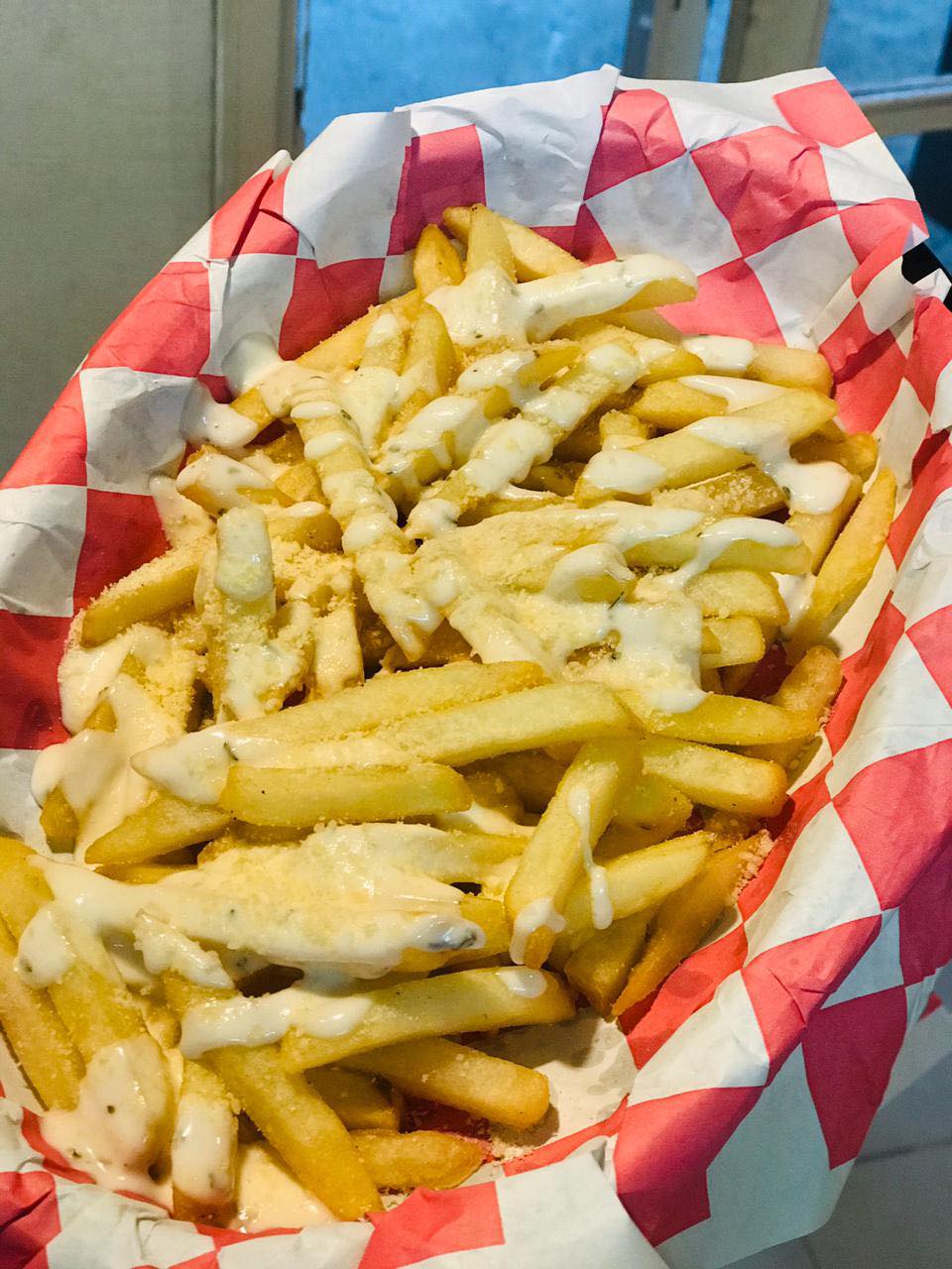 Carne arrachera, dedos de queso mozzarella, tocino, queso fundido, vegetales y queso americano. Incluye papas a la francesa.