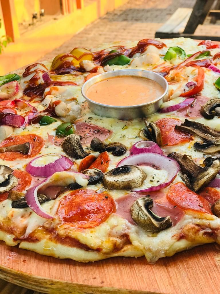 Con opción para elegir por default dos ingredientes: champiñones, pepperoni, chorizo, salchicha, jamón, pimientos, piña, cebolla morada, aceitunas y espinacas.