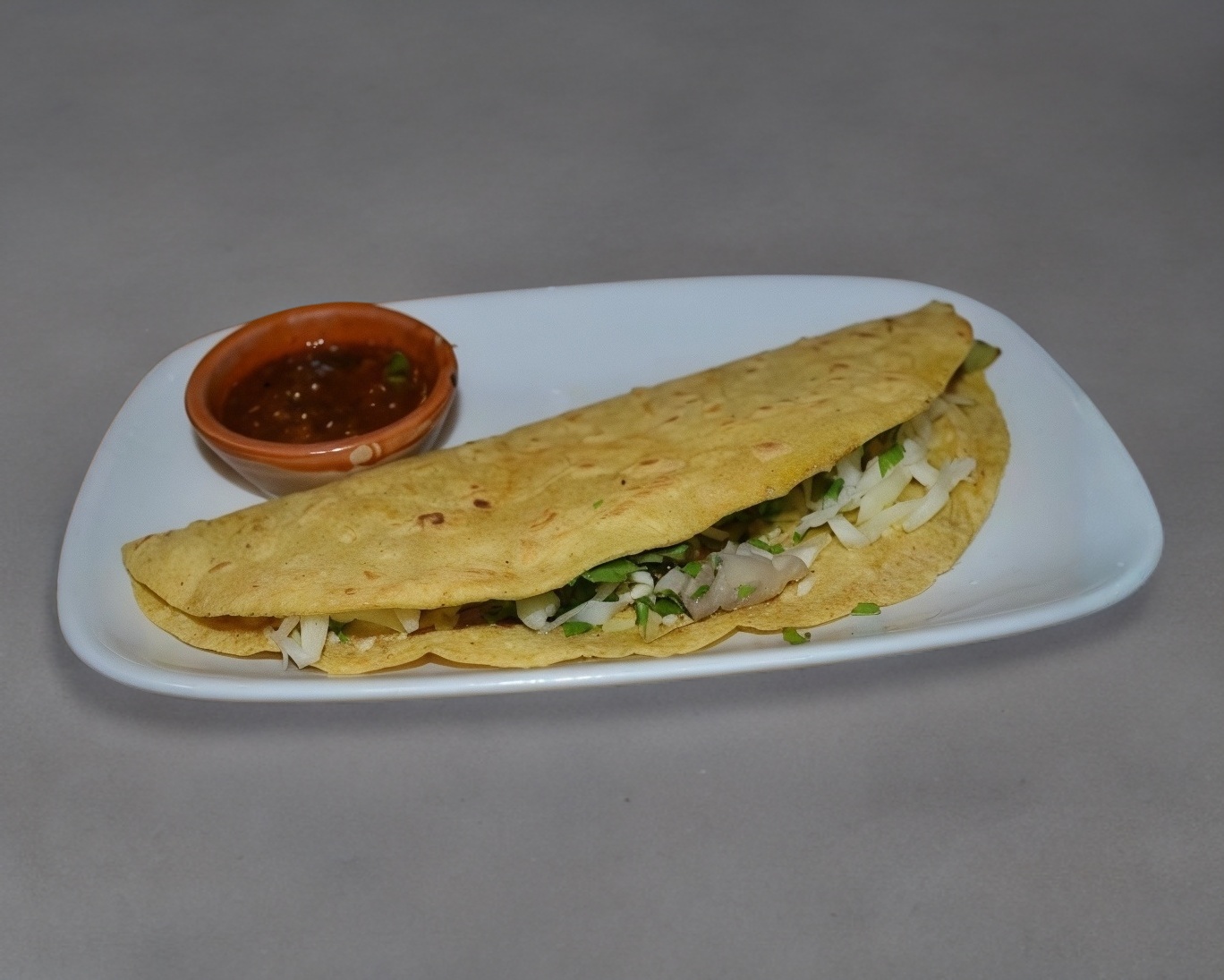 Tortilla de masa recién hecha se le hace una abertura y contiene un guiso se pone al comal para que el guiso este calientito acompañado de verdura, un pedazo de limón y una bolsita de salsa.