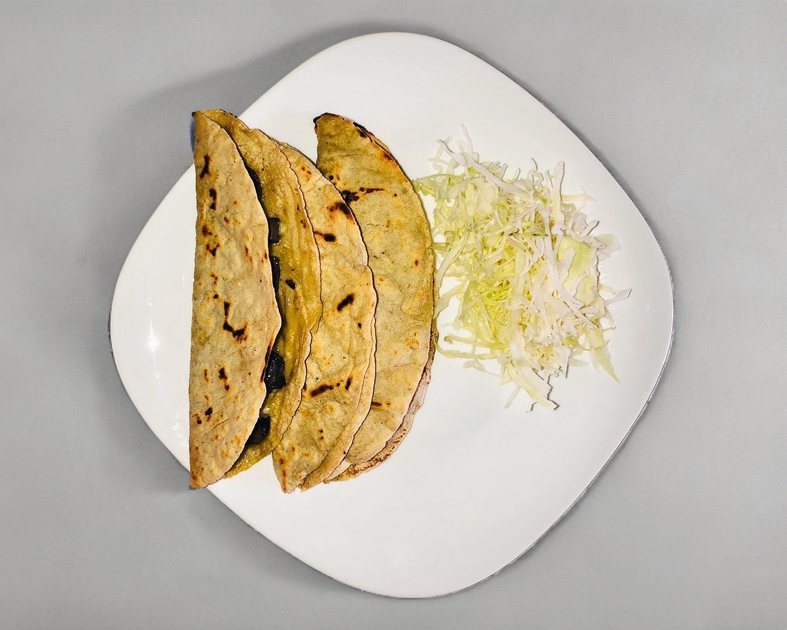 Tortilla de masa recién hecha lleva un guiso a elección, acompañado de verdura, limón y una bolsita de salsa.