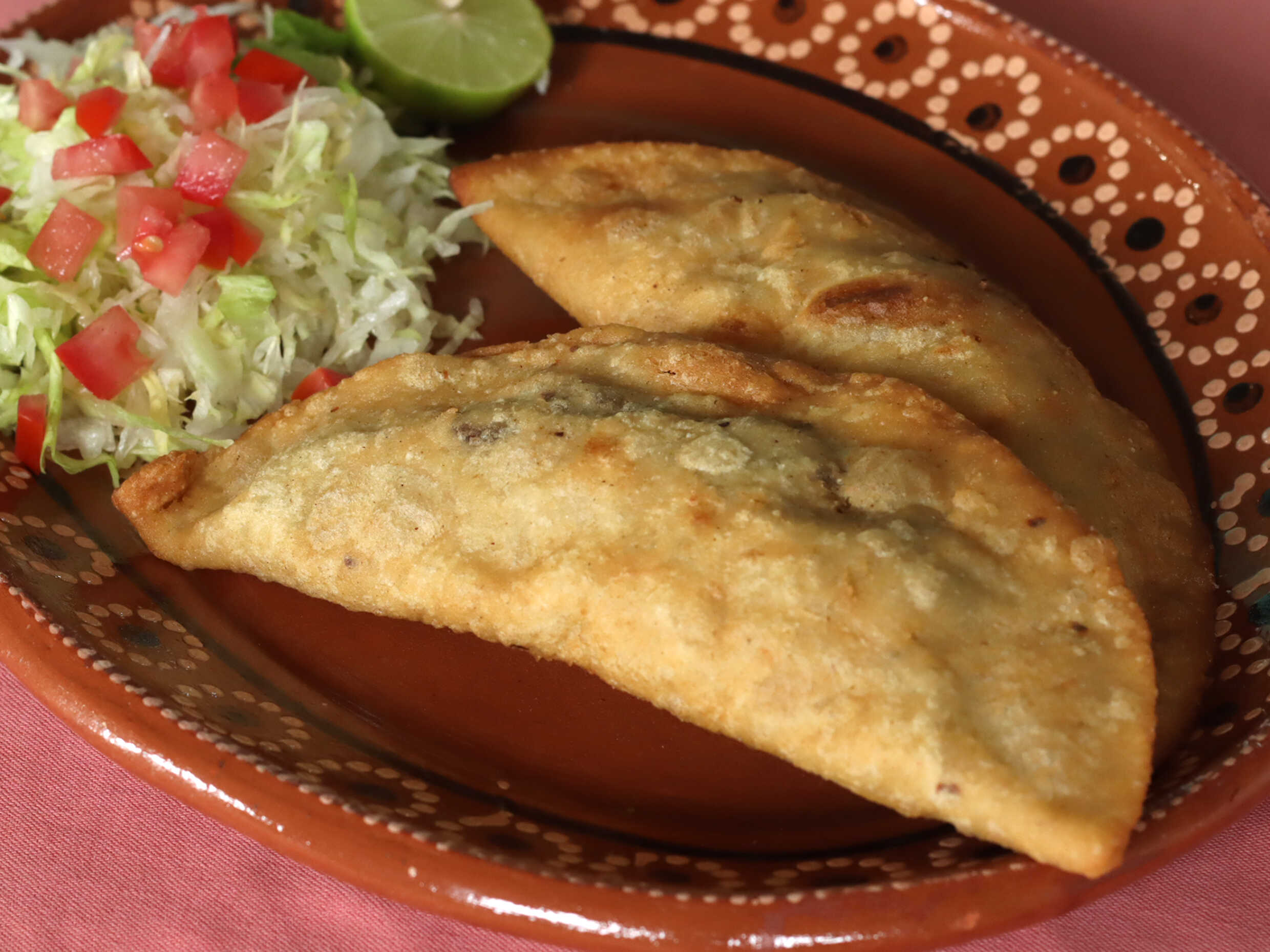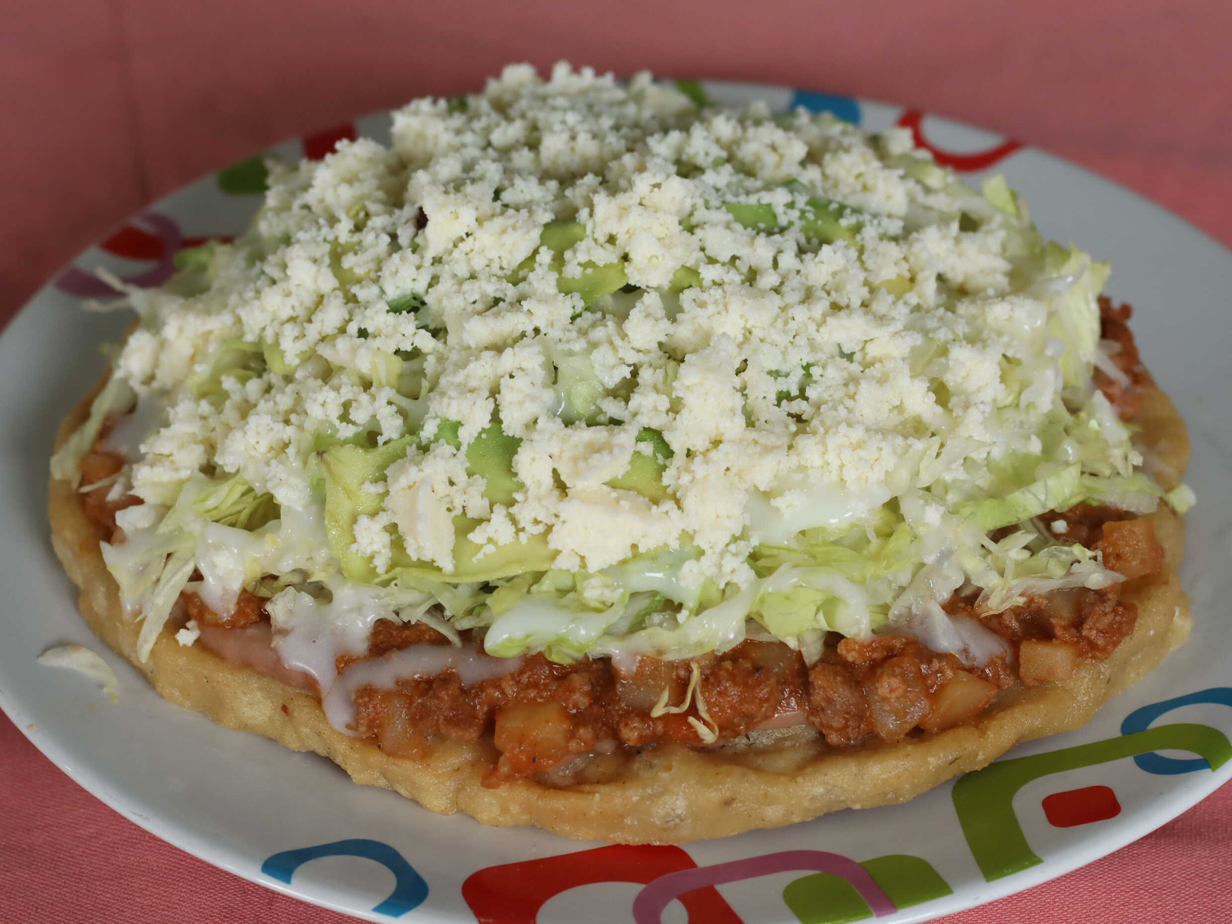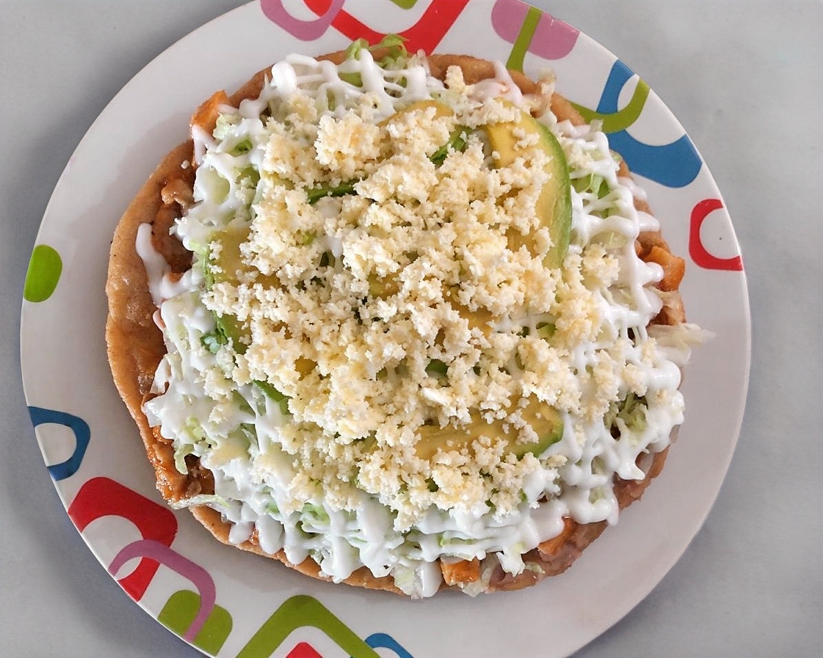 Tortilla de masa semicruda que se sumerge en aceite para terminar su cocción y dorarse. Lleva una cama de frijoles, el guiso de su elección, lechuga fresca, queso, crema y aguacate. Ideal para una persona.