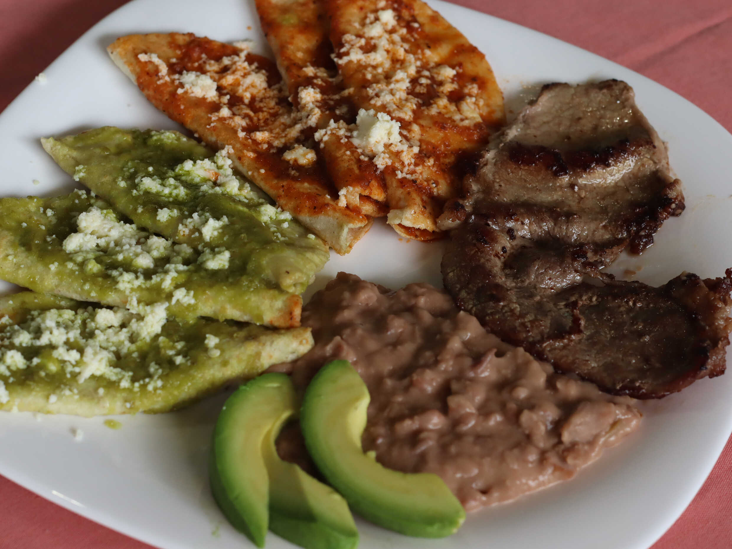 7 tortillas de maíz recién hechas bañadas en salsa de chile morita cubiertas de queso fresco, acompañadas de un pedazo de bistec, aguacate, queso y frijol.