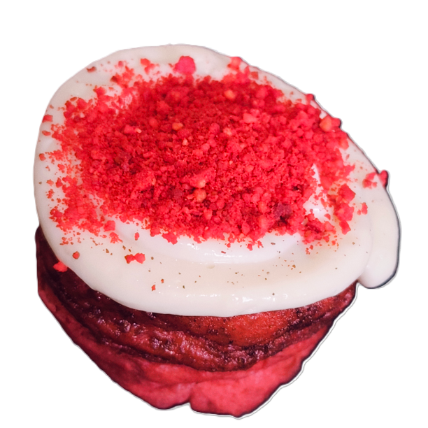Rol de Red velvet con caco y canela con glaseado de Queso Crema espolvoreado de galleta roja triturada