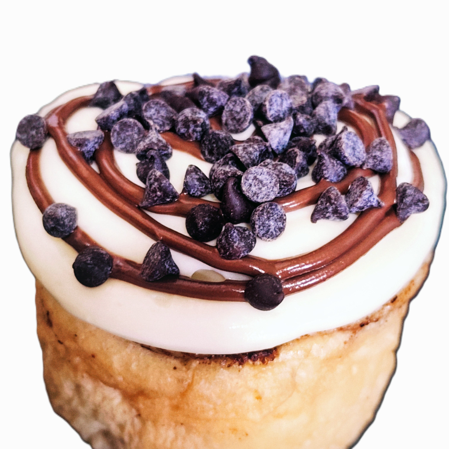 Rol de Canela con Glaseado de Queso Crema, un toque de Crema de Avellanas y chispas de Chocolate
