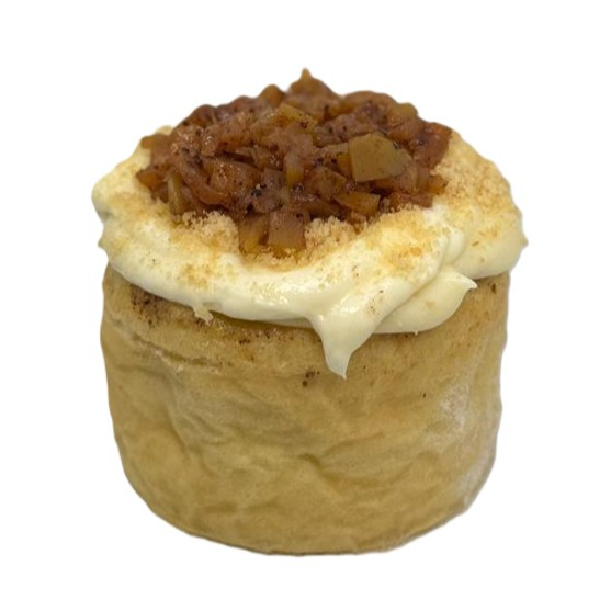 Rol de canela con glaseado de queso crema, canelitas espolvoreadas y manzana canela.