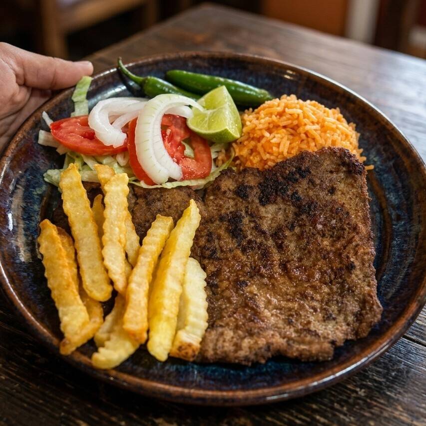 Milanesa de res acompañada de arroz,ensalada de lechuga,limon,papas y tortillas