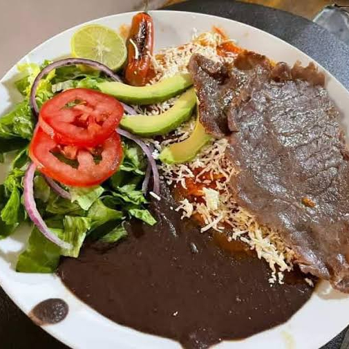 Orden de 5 entomatadas de queso acompañadas de carne de res a la plancha,frijoles,ensalada de lechuga y aguacate.