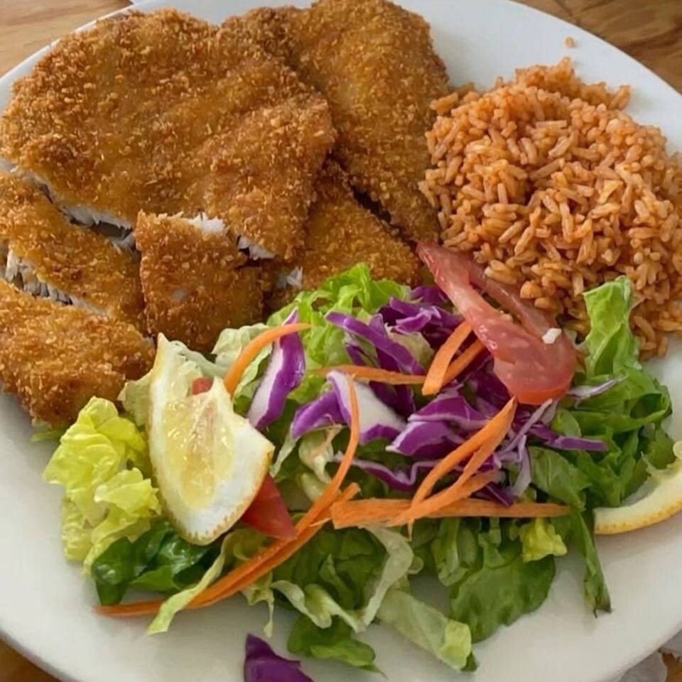 Milanesa de pollo acompañada de arroz,ensalada de lechuga,limon,papas y tortillas.